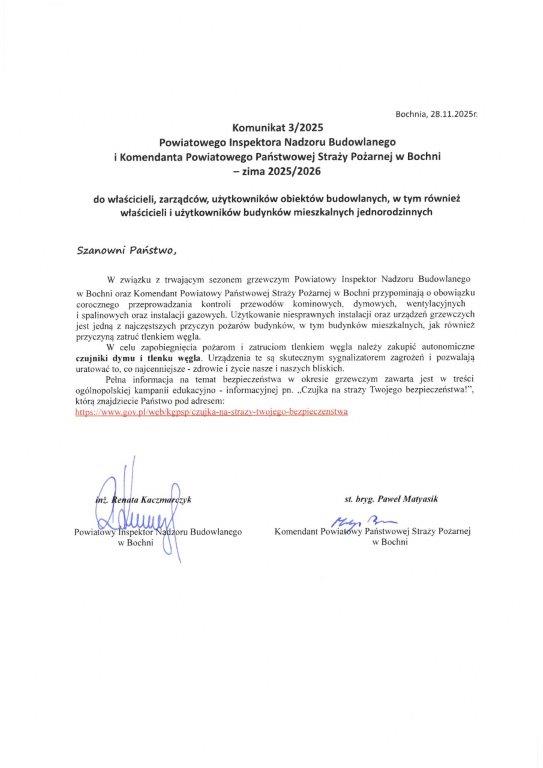 W trosce o bezpieczeństwo mieszkańców Powiatu Bocheńskiego, w związku z trwającym sezonem grzewczym - zima 2025/2026, a przy tym licznymi informacjami o przypadkach zatrucia tlenkiem węgla (czadem) i pożarach budynków mieszkalnych przekazujemy Państwu komunikat Powiatowego Inspektora Nadzoru Budowlanego i Komendanta Powiatowego Państwowej Straży Pożarnej w Bochni - zima 2025/2026.
